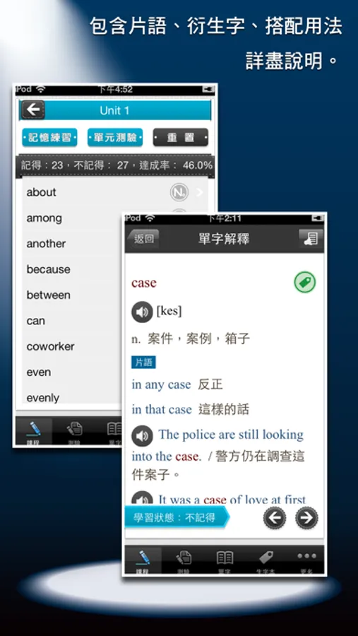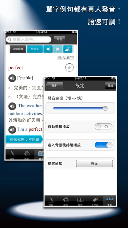 專為增強學習效果設計的記憶練習和測驗練習,讓您背單字更有效率也更容易!支援連續播放及背景播放功能,讓您有效利用零碎時間增強自己的單字功力。