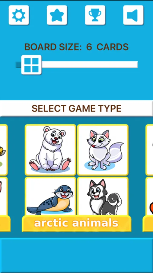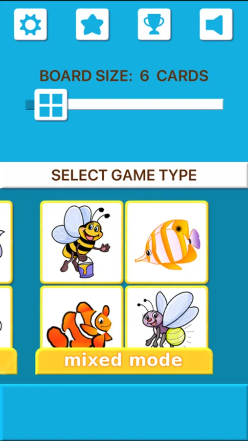 In mixed mode you can play all cards mixed from all unlocked packs. In every category you can select difficulty level according to your skills from 4, 6, 12, 20, 24 and 30 cards to play. In addition, this game will sharp your mind by training your visual memory and improve your ability to concentrate attention.