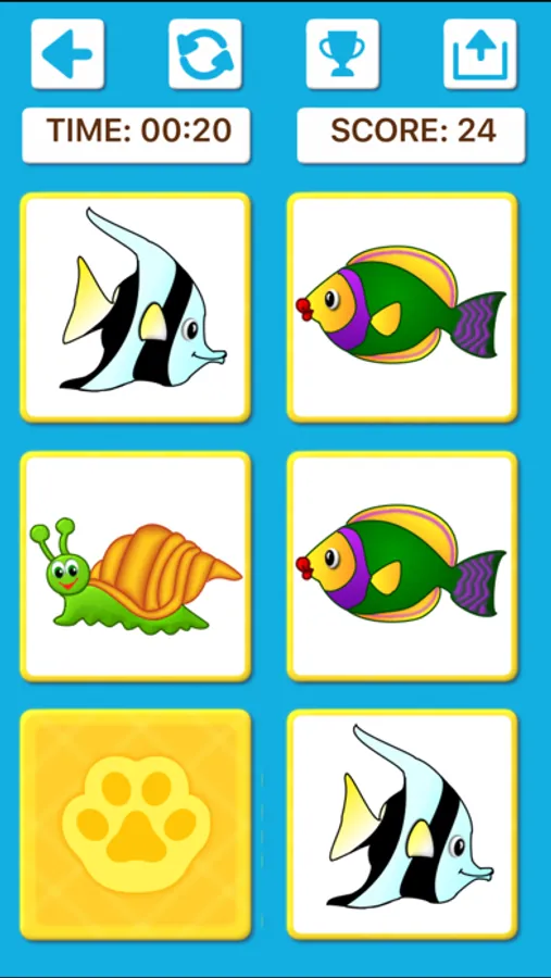 - 5 levels of difficulty with 2x2, 2x3, 3x4, 4x5, 4x6 and 5x6 cards