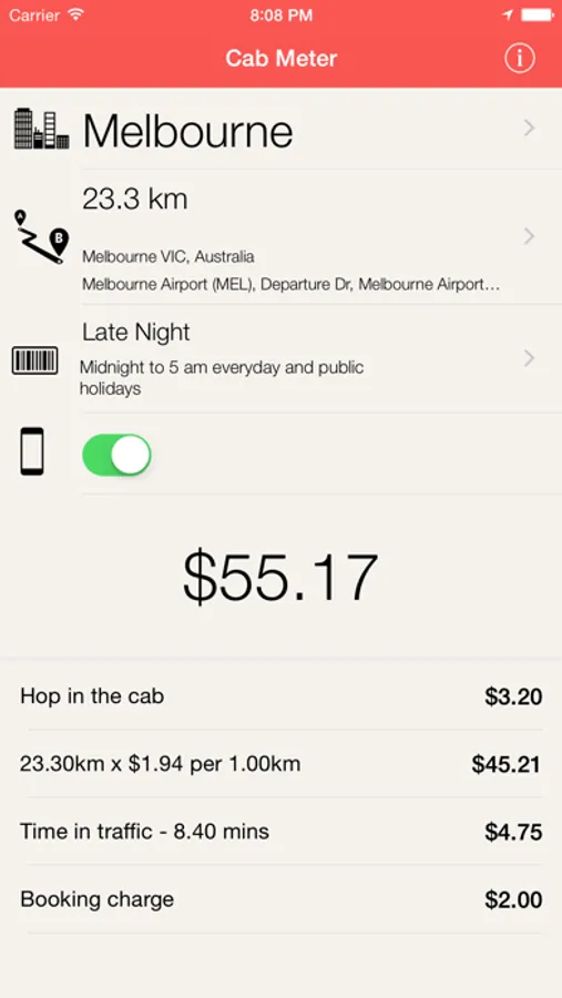 - Takes into consideration the traffic, flag fall, late night surcharge, booking charge