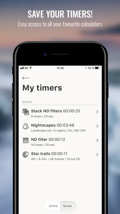 • ND filters: get exposure time when using one or more Neutral Density filters (also known as long exposure calculator).