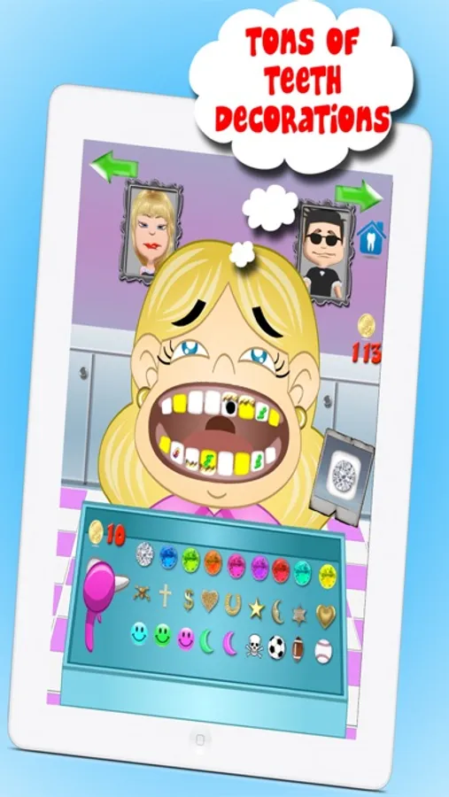 Wanted... Clean Teeth. Get your dentist license first and then select from 10 celebrity characters who need to get their teeth cleaned. Earn coins as you play to unlock additional characters, dentist tools, and decorations.
