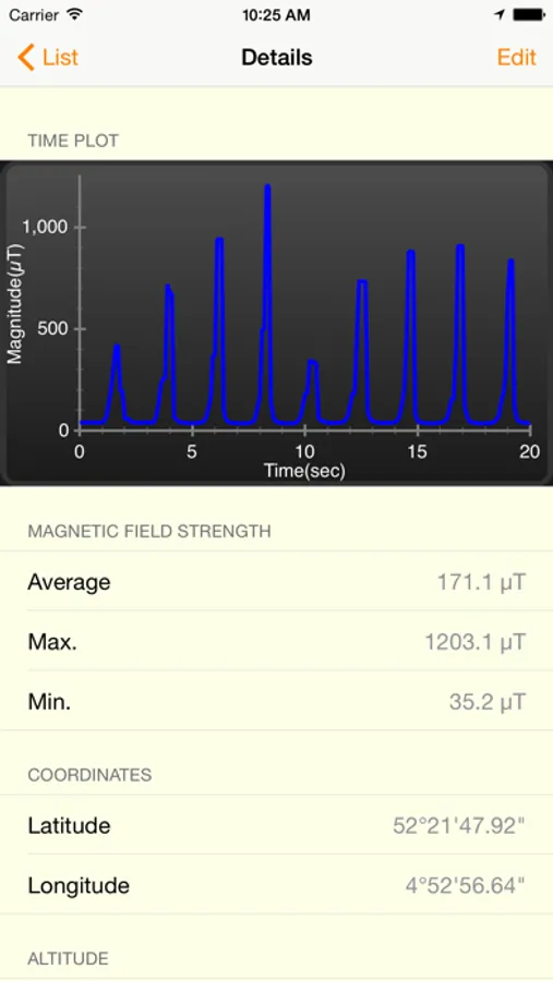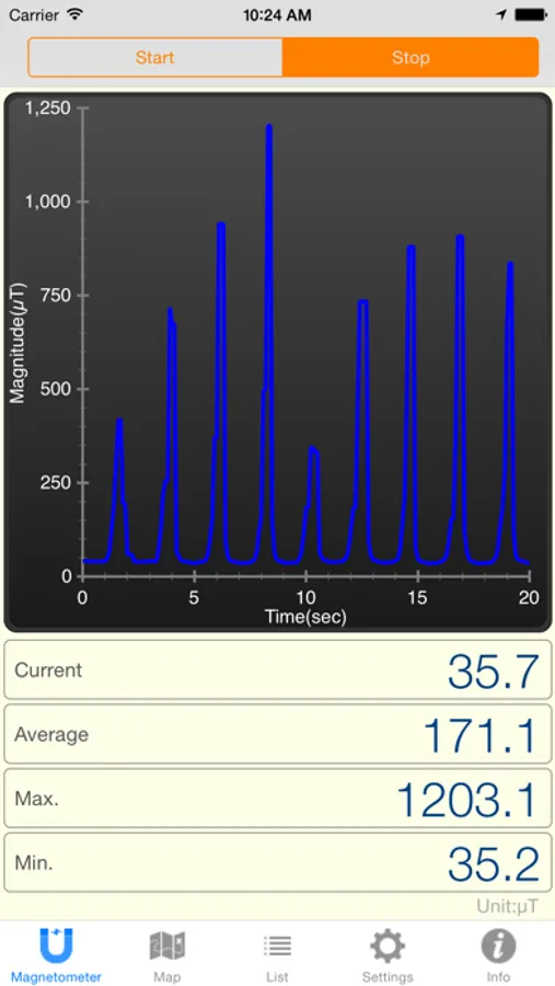 1) The magnetic field measured by this app is the total magnetic field in the device's vicinity without device bias (Earth's magnetic field plus surrounding fields, without device bias).
