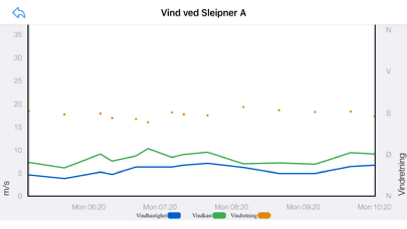 Ved å trykke på et element i listen av måleverdier på siden for detaljert stasjonsinformasjon vises en grafisk presentasjon av innsamlede data. Tidsintervallet er som standard satt til å vise de siste 6 timene, men kan endres i appens innstillinger ved å gå inn i telefonens "Innstillinger"-app og scrolle ned til App-ikonet. 3, 6 og 12 timer er alternativene.