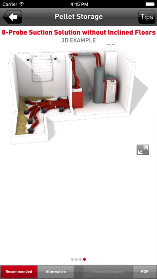 Windhager's Pellet Storage application helps design your pellet storage room. The highlight of this app is a calculation program that not only includes all needed values, such as maximum pellet capacity and inclined floor measurements, but also recommends a specific probe system. The end result is a design with a 3D view that can be converted to a PDF and printed, or sent via email.
