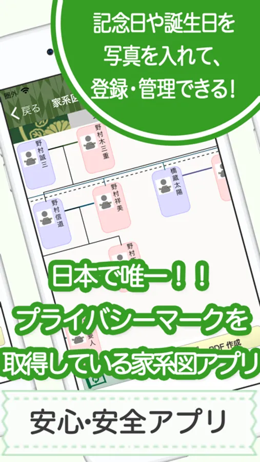 家系図アプリは、家系図取扱業として唯一のプライバシーマーク取得企業が運営しておりますので、安心・安全にご利用いただけます。