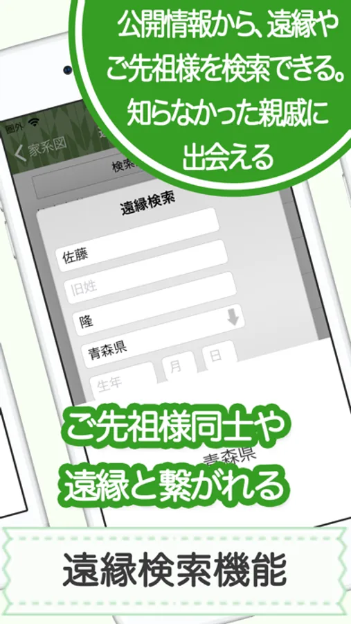 ※家系図アプリは、情報検索に関しネットワーク連携しておりますので、アプリの製品上の問題ではなく、サーバーや回線の負荷により「一時的にアクセスできない」「検索内容が表示されない」などの状況が発生する場合もございます。更に、機種により旧字体等の表示・入力ができない場合がございますので、誠に恐縮ではございますがユーザー様には上記をご理解の上、ご利用へのご協力をよろしくお願い申し上げます。