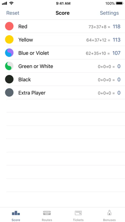 Counting final score in Ticket to Ride may be time consuming and error prone. This app will help you to count final score for all players fast and error free. Just enter routes length, tickets score and bonuses for each player and the app will arrange players according to the score (refer to the rules in case of tie-in).