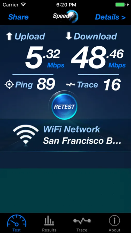 – Simple, one button tap performs (or cancels) the internet speed tests.