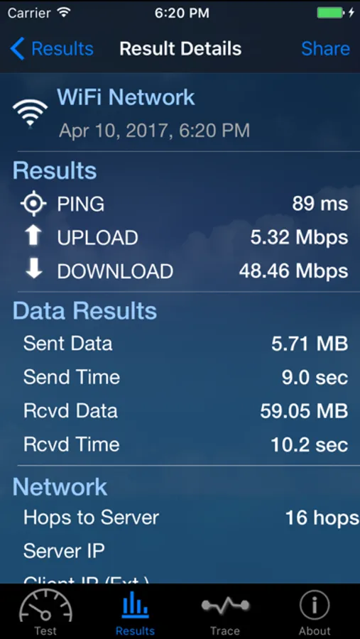 - Conveniently share results with others via Facebook, Twitter, Email or Message.