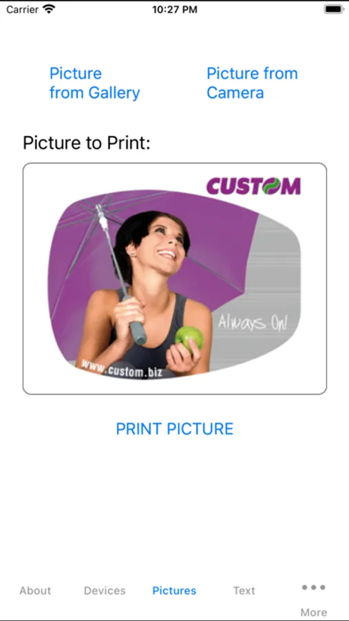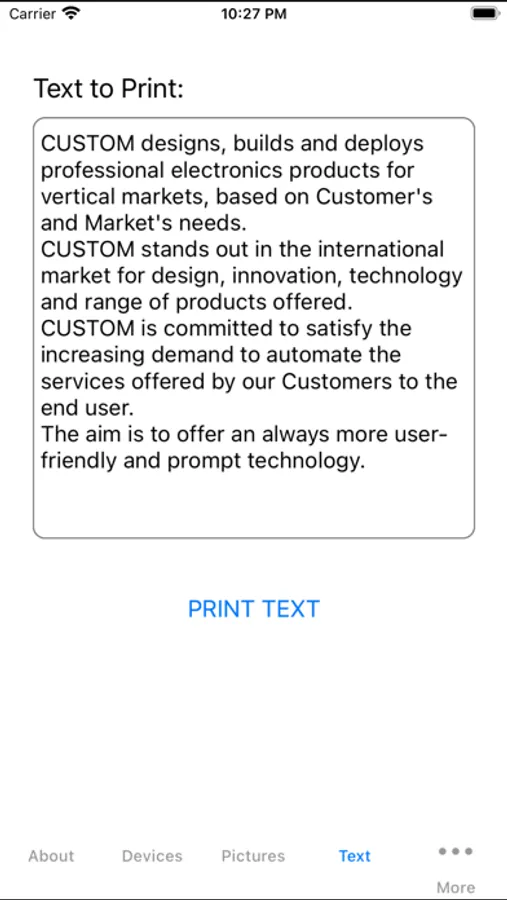 Thanks to CustomiOSPrint software, and its CustomiOSApi Library, it is possible to print Texts and Pictures / Photos directly from the smartphone through the Bluetooth and Wi-Fi interfaces. It is also possible to print Barcodes, 2D Barcodes, Webpages, Contacts and Events.