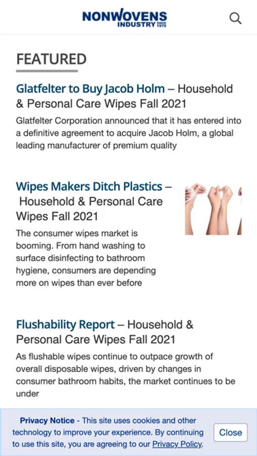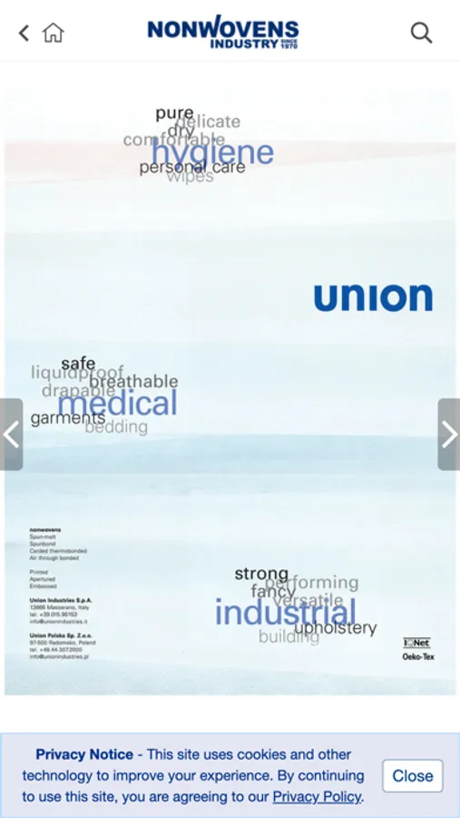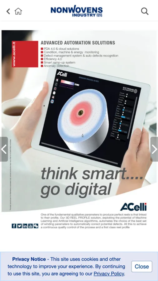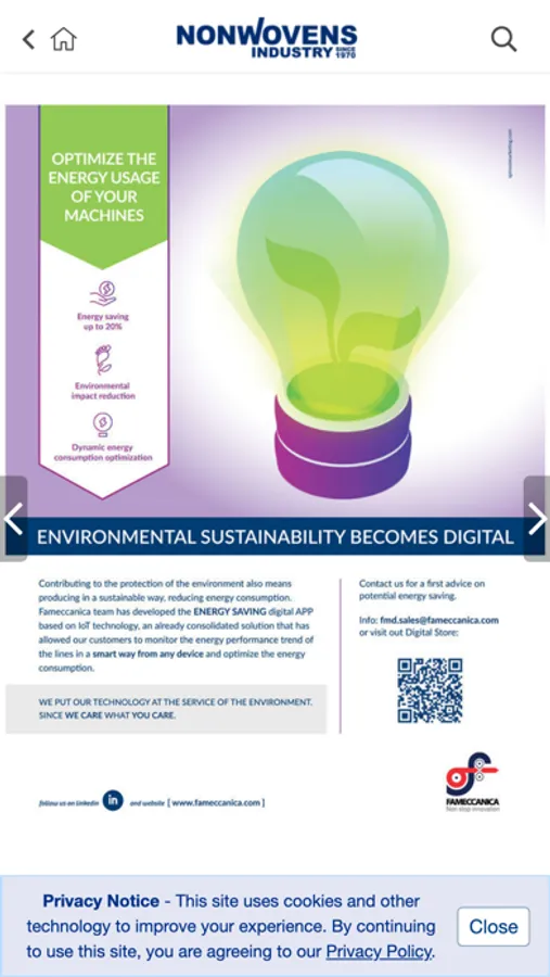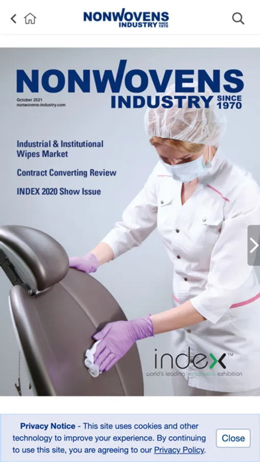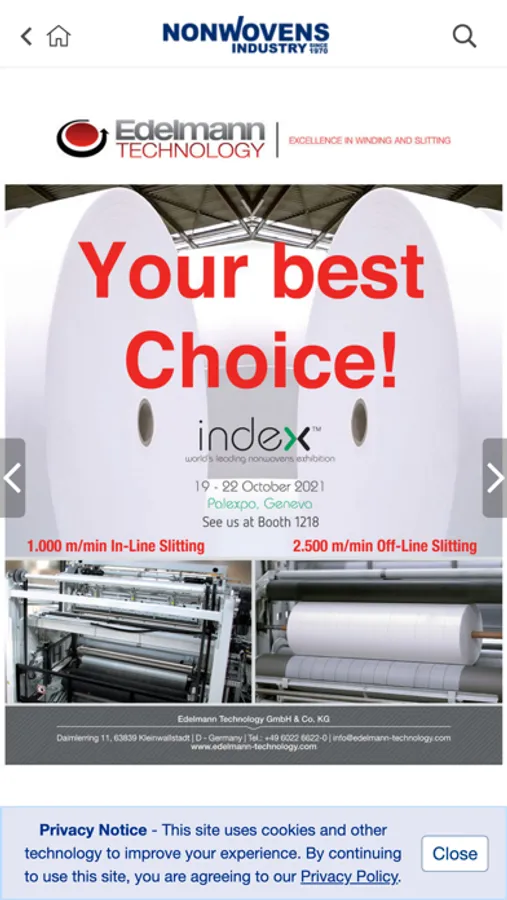 NONWOVENS INDUSTRY is the only monthly trade magazine dedicated to the worldwide business of nonwovens. For more than 40 years the magazine has tracked the growth of the nonwovens industry through years of changes, technology, evolution and market development. No other magazine has been around for as long or covered as much of the global nonwovens business. Our outstanding editorial staff follows industry trends and issues, conducts market surveys and technology updates and tracks the latest nonwovens news around the globe as it happens. We also attend every major nonwovens industry trade show and conference. Nonwovens-Industry.com, is the industry’s best-used independent website dedicated to providing in-depth industry coverage, late-breaking news and useful tools and applications for finding actionable industry data in a hurry.