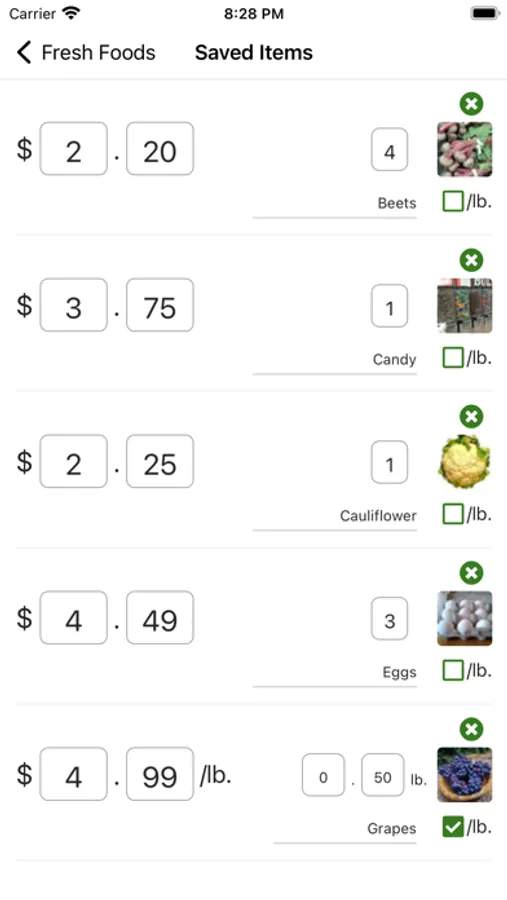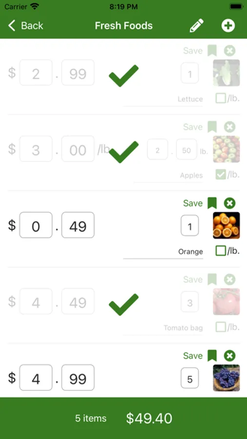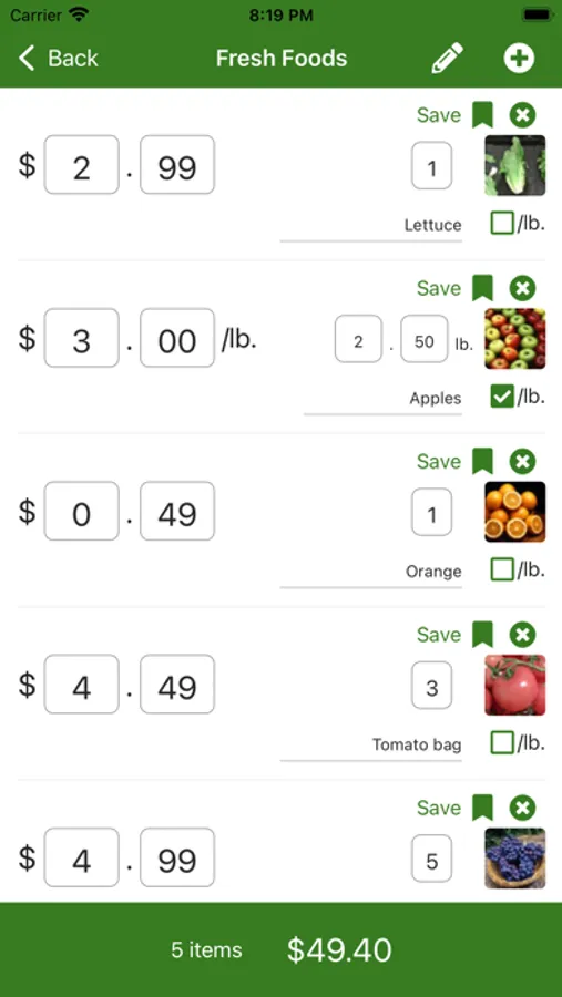 Create grocery lists for each store you shop at, preview the total price, and then check off each item you pick up in the store. Groceries can be priced by quantity or weight. Price It includes many fresh food images that will automatically appear when you enter the name. Easily save frequently-purchased grocery items for new grocery lists in the future.
