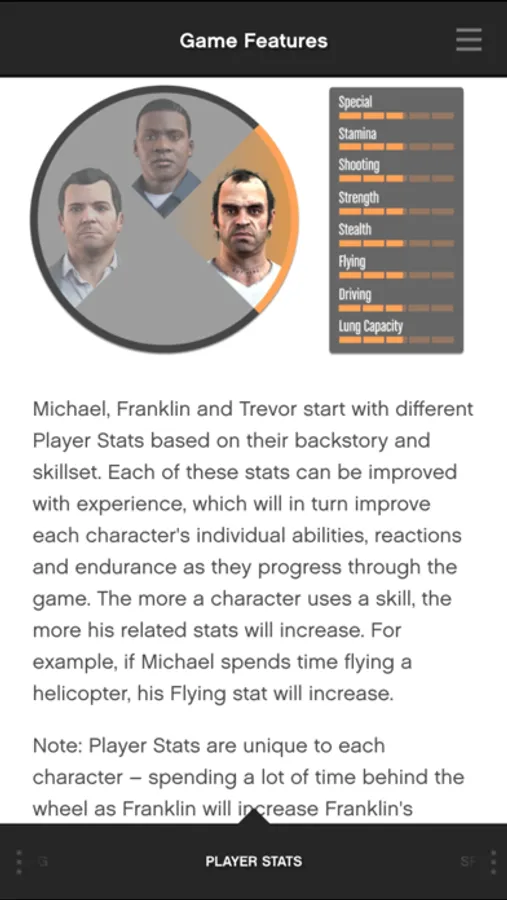 GTAV: The Manual is the official manual app for Grand Theft Auto V. Contains over 100 pages covering everything from Game Controls, and Features to a tour through the local neighborhoods and activities across Los Santos and Blaine County - plus a special interactive version of the game map to zoom in and explore.