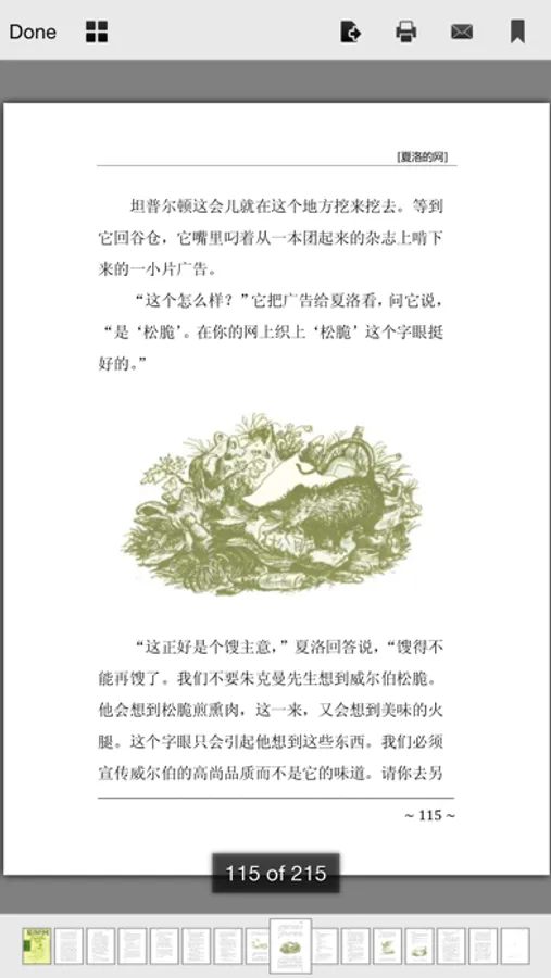 “夏洛,"威伯停了一会儿说,“你怎么一点声音都没有啦?”“我喜欢静静地呆着,”她说,“我一向喜欢安静。”“可是你今天好像有点不一样,你没事吧?""可能有点儿累吧,不过我挺满意的。你早上在会场上的成功也有我的小小一份功劳。你将来会没事的。你能够太太平平地活下去啦,威伯。没有什么东西再可以伤害你了。往后是秋天,会变凉,白天会变短,叶子会从树上掉下来。然后是圣诞,是冬天,会下雪。你会活下去,看到冰封雪飘的好风景,因为你对查克曼家意义重大,他们不会伤害你了,再也不会了。冬天过去后,白天又会变长,池塘里的冰就会融化。百灵会回来唱歌,青蛙也会醒来,又会吹起暖暖的风。所有这些好看的东西,好听的声音,好闻的味道,都等着你去欣赏呢,威伯,这个美好的世界,这些珍贵的日子。”夏洛说着说着停了下来。
