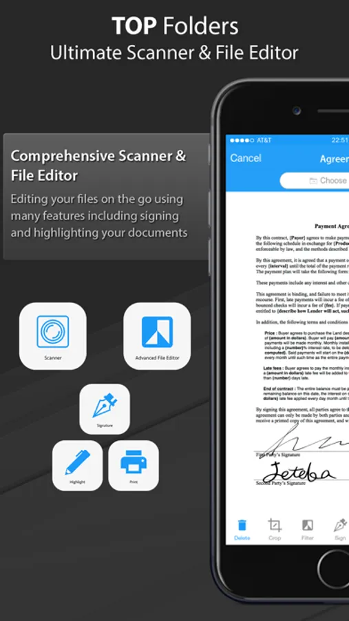 Using the latest mobile scanning technology, you can use Top Folders to create high quality PDF scans of any document. At 200 dpi and higher, the scan quality rivals many modern desktop scanners! Optimize your scanned files with a wide range of intelligent editing options, print directly from the app or sync to the cloud with a tap of the screen.