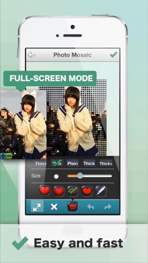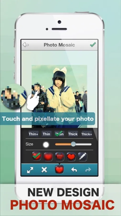 Pixellate parts of your photo.Make those parts you don't want others to see hidden!And you can also use it to create interesting and funny effect from your normal photos.Use your imagination to make humorous photos!