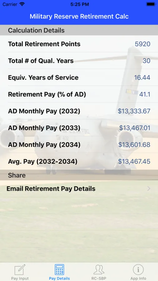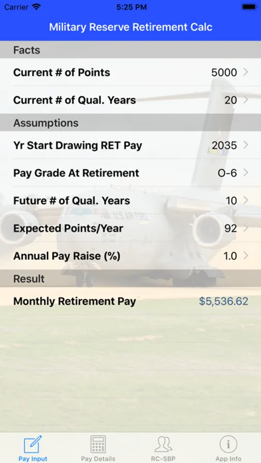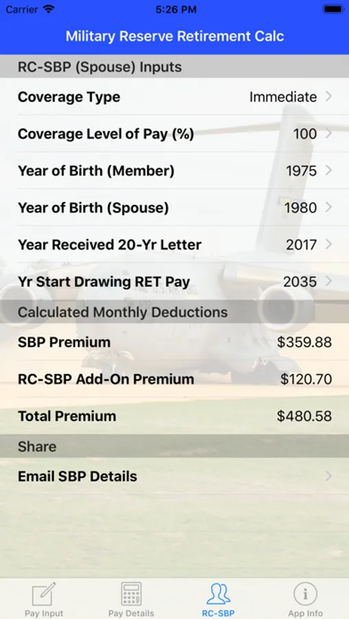 Easily calculates the expected retirement pay and Survivor Benefits Program (SBP) deductions for US military reserve and guard service members.