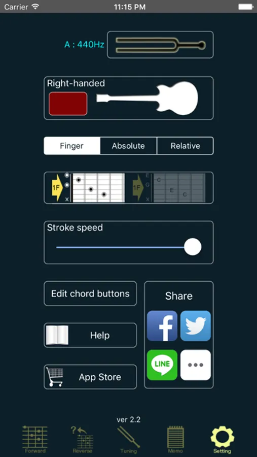 The chord buttons displayed on the top page can be customized. Results from all designated string lookups can be added to the top page as a button. Also, it is possible to delete or rearrange buttons on the top page, or to reset it completely to its original state.