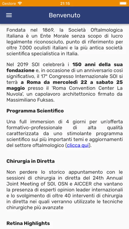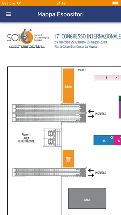 L'App Congressi SOI consente di consultare i programmi dei due Congressi annuali SOI, ricercare e visualizzare gli eventi ai quali è iscritto e salvarli tra i preferiti, la mappa della sede, la lista degli espositori, ed ogni informazione utile legata al Congresso.
