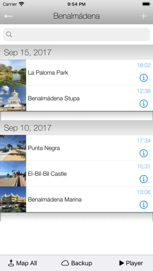Your GPS location is central in Trip Player, because new entry can be made only if your device detects your location. Each location can have name, note and photo attached.