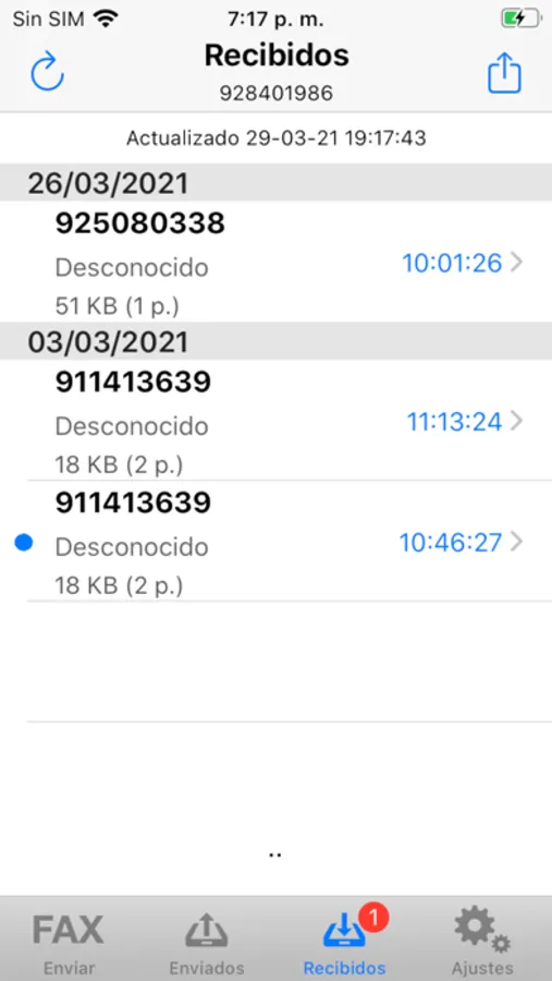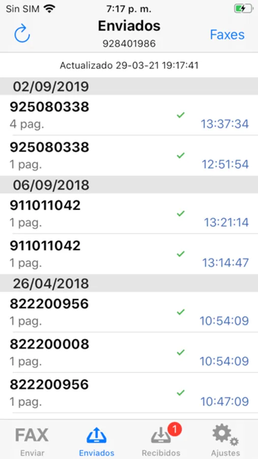 * Historial de faxes online enviados.