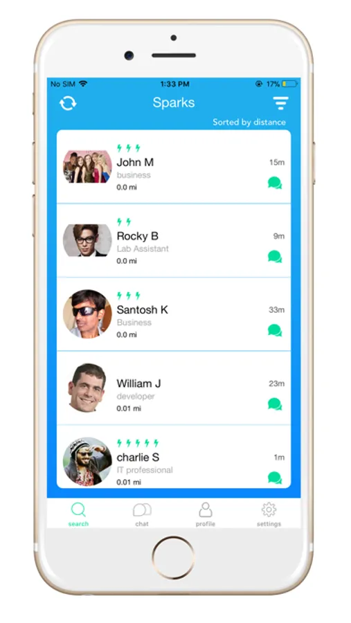 #3: Search for people in close geographic proximity with matching sparks. Sort them by distance, number of matching sparks, or by one specific spark.