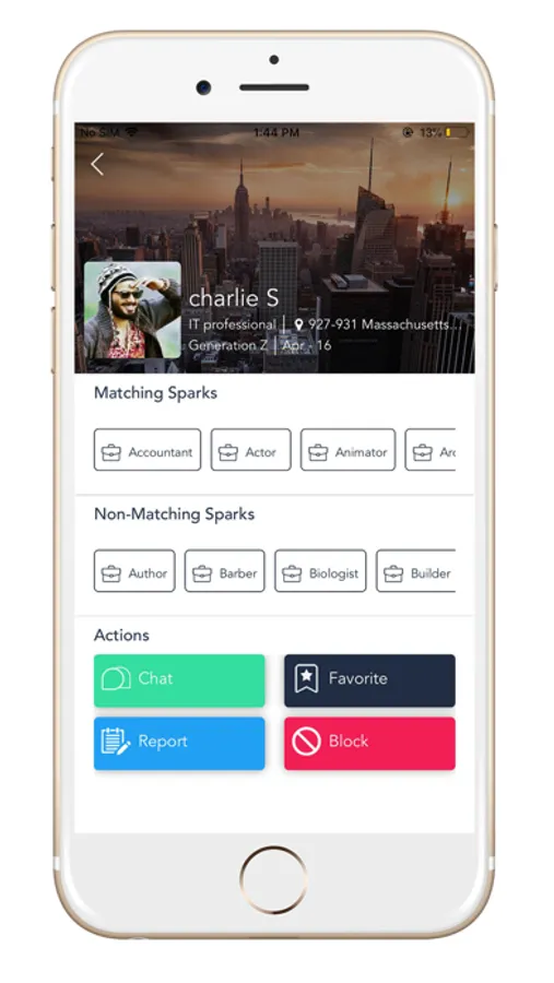 Sparkify® is geared to matching common interests to "spark" a conversation. It is not geared to dating, business, or social. Of course, anything is possible after you meet someone, but that is up to you. You have your initial icebreakers. Sparkify® profiles are short and professional. A first name and last initial, a professional picture, and some very basic personal information are all that are listed. The simplicity and selection of "sparks" to screen for matches of selected common interests that you can change at any time sets Sparkify® apart from other social networking apps.