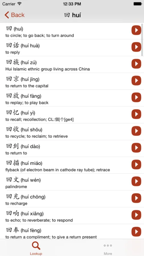 For each character the app contains up to 100 words and phrases together with English translation and Chinese pronunciation.