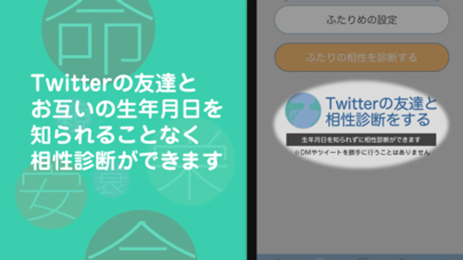 - Twitterと連携し誕生日を教えあうことなくDMで相性診断