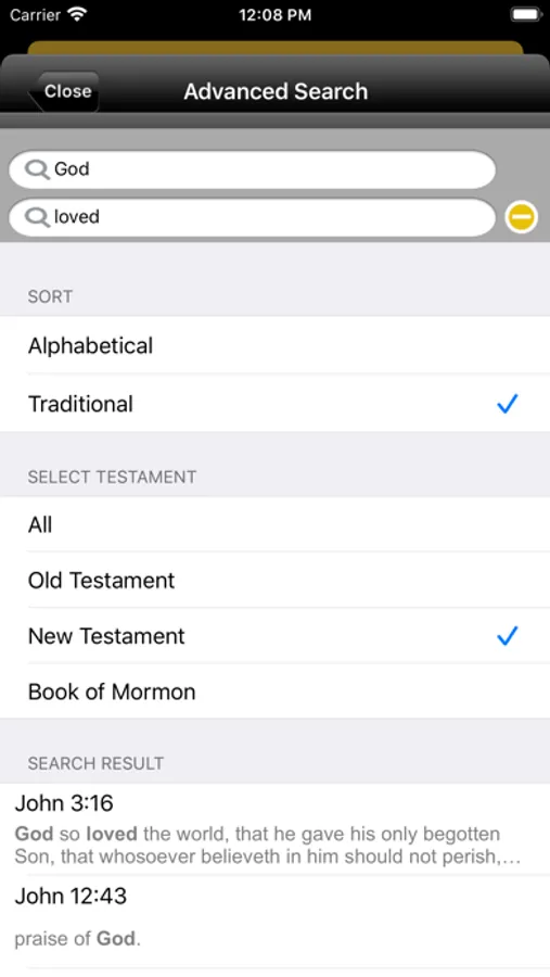 • Search: simple search to look for words or phrases; compound search allows search of any two words or phrase and returns the verse that contain both; search words are bolded in the results, sort traditional or alphabetical, filter on Old Testament, New Testament and Book of Mormon results