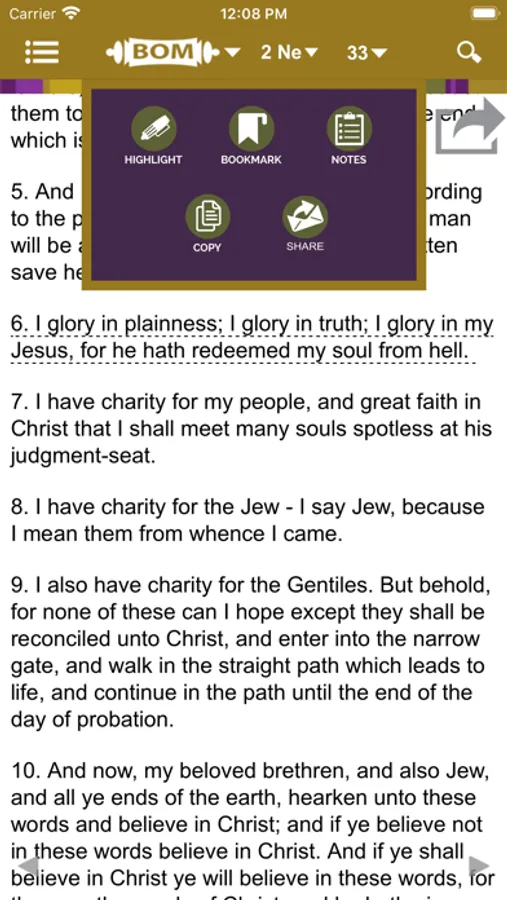 • Browse: browse through the scriptures by book and chapter; drop down menus make it easy to find any book and chapter easily