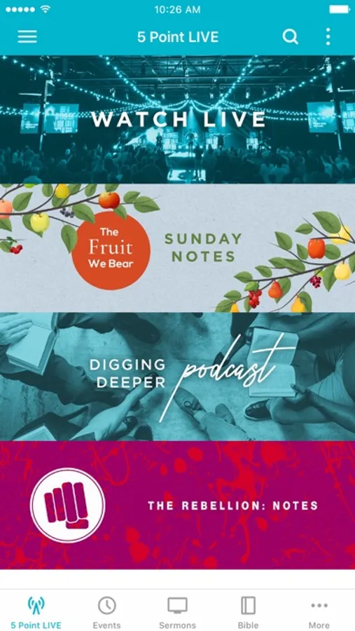 The 5 Point Church app was developed with the Subsplash App Platform.