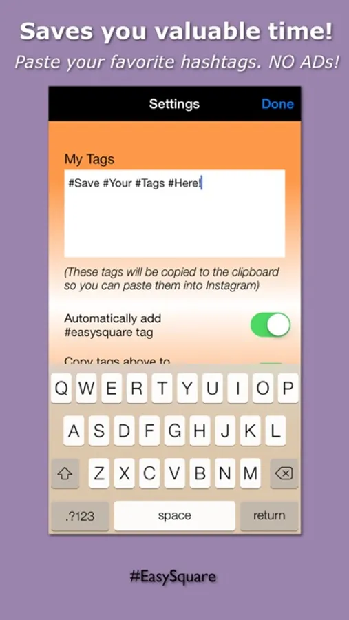 SAVES HASHTAGS: Save time by entering in the tags you use often and Easy Square for Video will put those into the clipboard for easy pasting in Instagram!