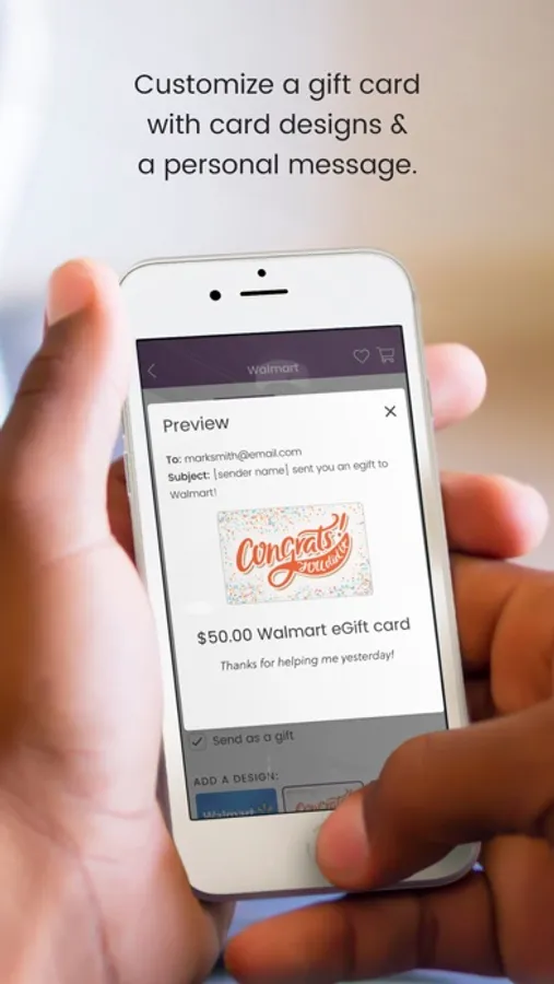 Our free app is loaded with features that will easily direct you to the gift you're looking for. Shop for traditional plastic gift cards or get an eGift card you can download for immediate use. In addition to a wide range of gift card types, customize a gift card with card designs and a personal message.