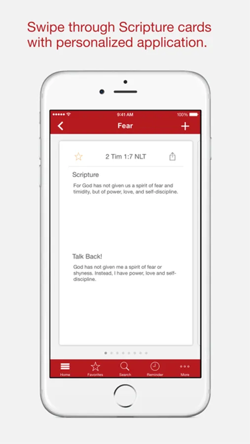 Swipe through cards that present scriptures with personalized application. Save a card to your favorites for quick access later.