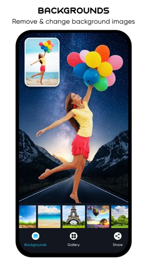 Photo background editor: Adjust the brush size to erase the image, once the desired portion of the photo is erased, you can add a background to it using this background changer. Share the erased image with your loved ones through social media platforms.
