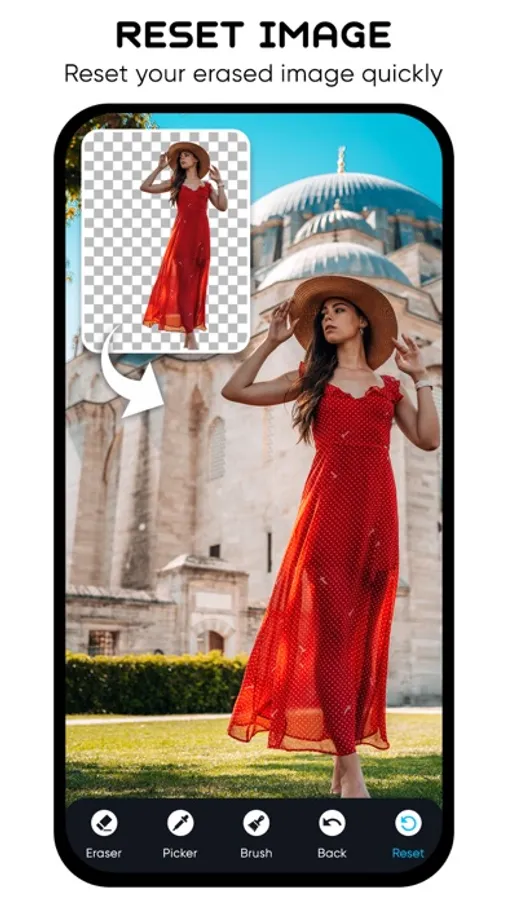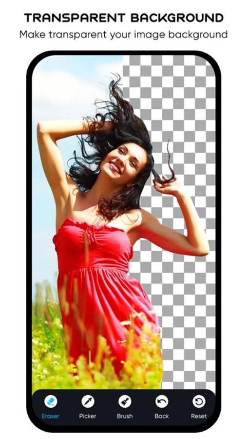 Erase photo background: Select a photo from the phone or take a snap using the camera feature, erase the unnecessary areas in the image by selecting a color or manually using your finger with this background remover. Use the undo option to go one step backward and the reset option to get back the original image.