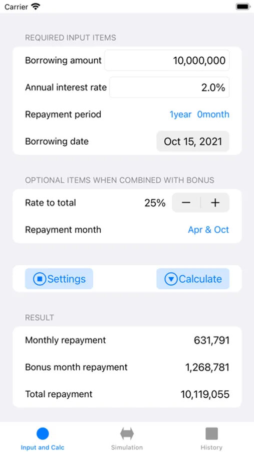 - Calculation method can be selected from the settings (principal & interest equal, principal equal)