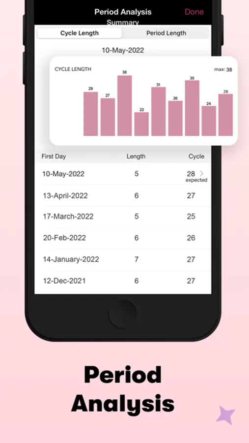 By default, the app defines cycles as irregular if the cycle has a length of less than 21 days or over 36 days but these values are easily personalized to fit your needs within Settings.