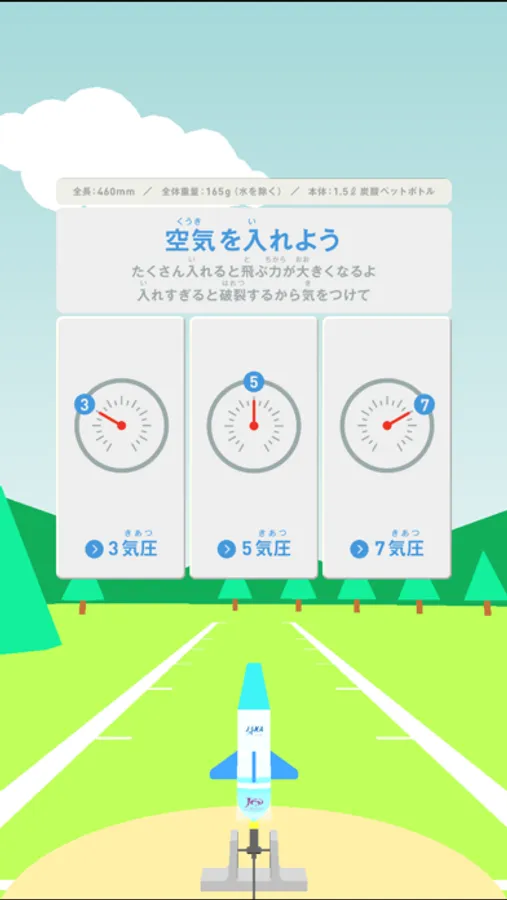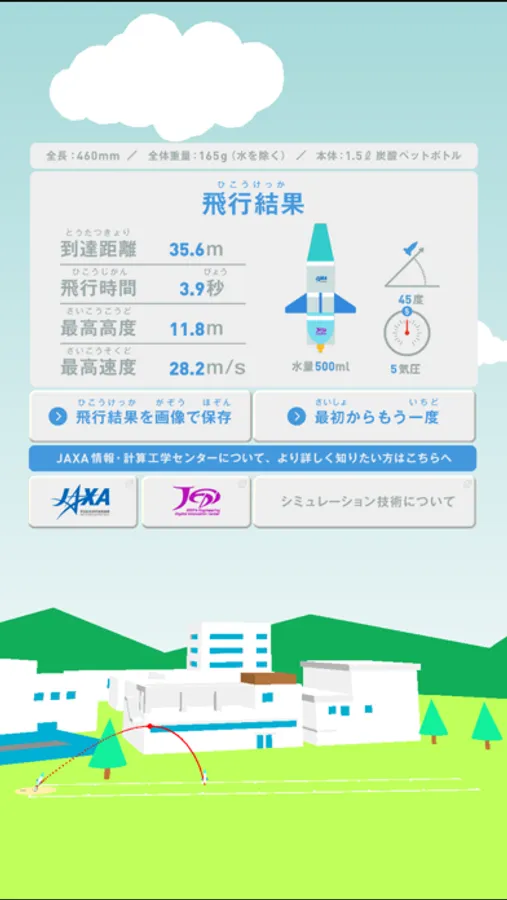 「水ロケットシミュレータ」は、iOS向け水ロケットの打ち上げシミュレータです。部品を選んで水ロケットを組み立て、水と空気を入れて、ランチャーの発射角度を設定して、水ロケットを発射します。