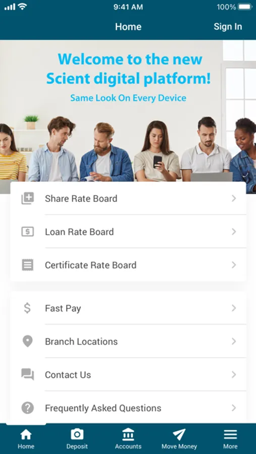 Scient Federal Credit Union Mobile provides members convenient access to our website, mobile check deposit, mobile banking, branch and contact information.
