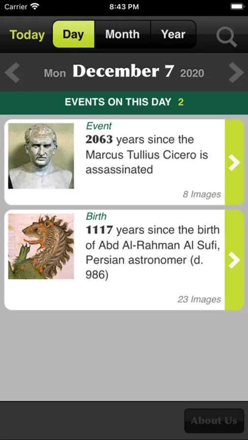Historica Calendar app features thousands of key historical anniversaries, covering two years from now, which have been created by our curators and researchers. Each event is accompanied by a set of stock photographs, which can be previewed in High Resolution on your device. Just pinch each picture to begin ZOOM-ing...