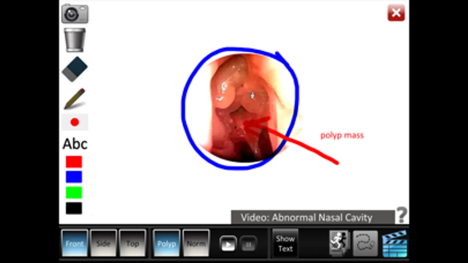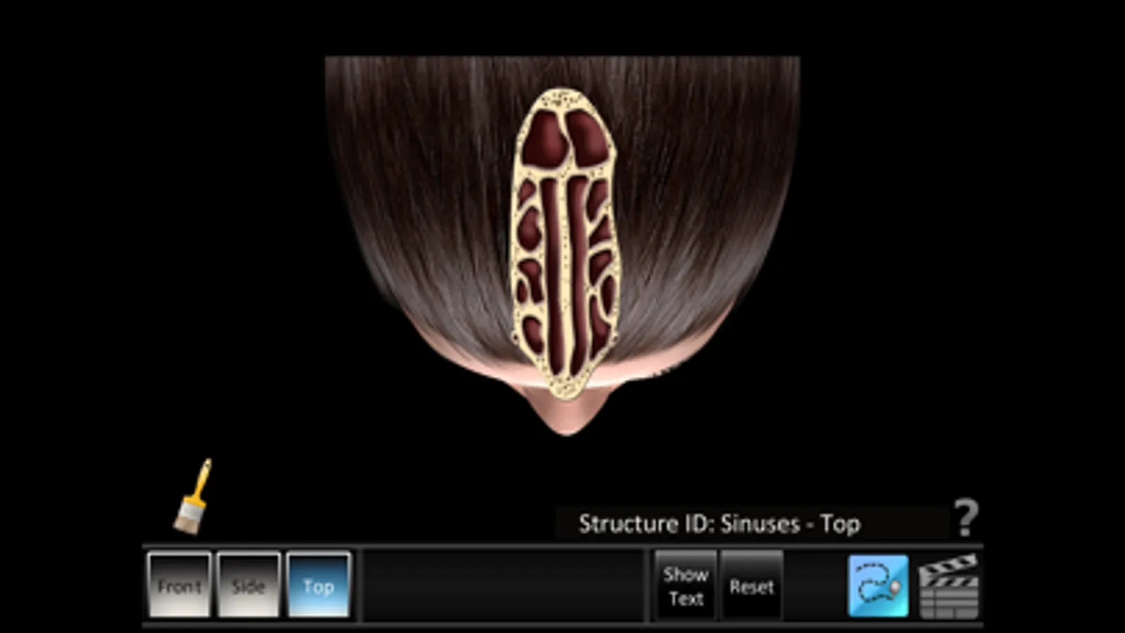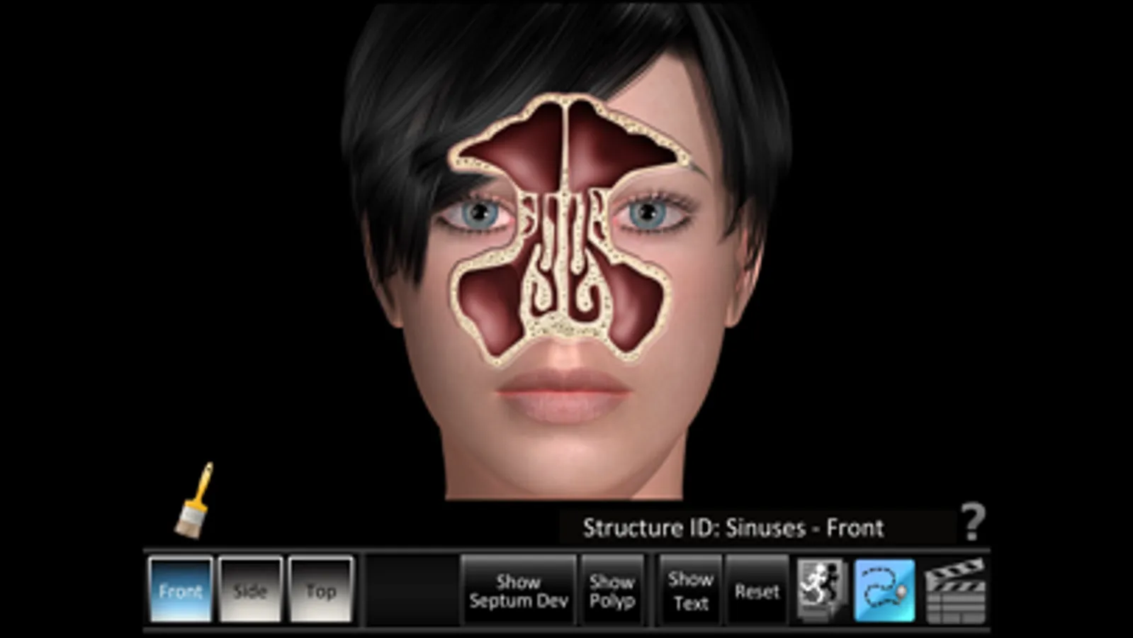 • Structure ID for the front, side and top sinuses and side turbinates. As each part is touched, the part highlights and the part name and description text changes. Description text shows or hides on demand.