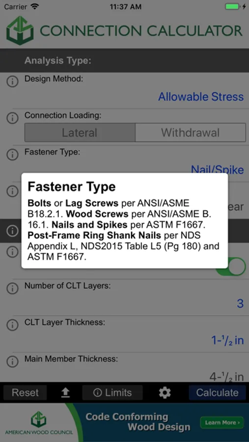 While every effort has been made to insure the accuracy of the information presented, and special effort has been made to assure that the information reflects the state-of-the-art, neither the American Wood Council nor its members assume any responsibility for any particular design prepared from this on-line Connection Calculator. Those using this on-line Connection Calculator assume all liability from its use.