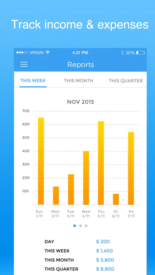 Both income and expenses are visible in dashboard views in Reports page so that you can keep track of your cash flow.