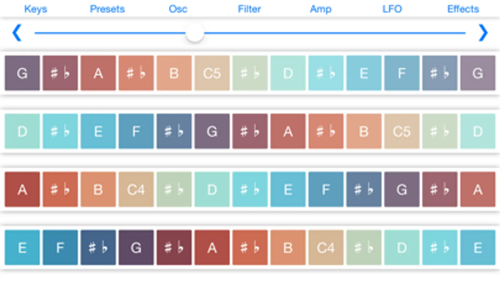 - Sliding across keys in a row results in legato sliding or portamento gliding from note to note
