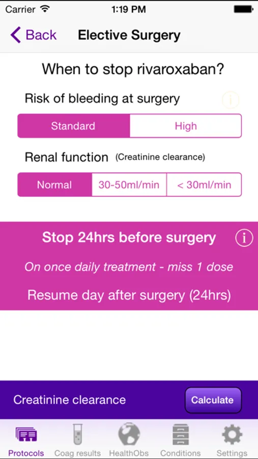 A common question with any anticoagulant is how long should treatment be stopped before surgery? The Rivaroxaban App calculates a safe interval between stopping treatment and surgery and offers advice for treatment prior to emergency surgery if the surgery cannot be delayed.