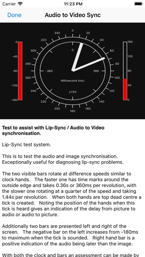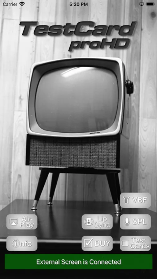 Access to the test cards on the external display, Virtual Blue Filter and the SPL meter are only available after an In-App purchase. Using the default test screen please ensure that you have tested your device with the media adaptor, or Apple TV, on the external display before purchasing access. This is to allow you to verify that your system is fully compatible before purchase, and to share a single purchase with your iOS devices and Apple TV.