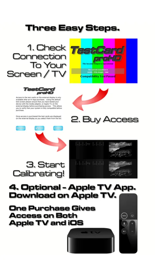 Professionals use test cards to calibrate broadcast systems and cinemas use them too, so why shouldn’t home cinemas or theatres use them too? TestCard ProHD is the innovative means to calibrating your screen to ensure a consistent and correct representation of display media. (In-App purchase required after ensuring this will work on your TV / Display.)